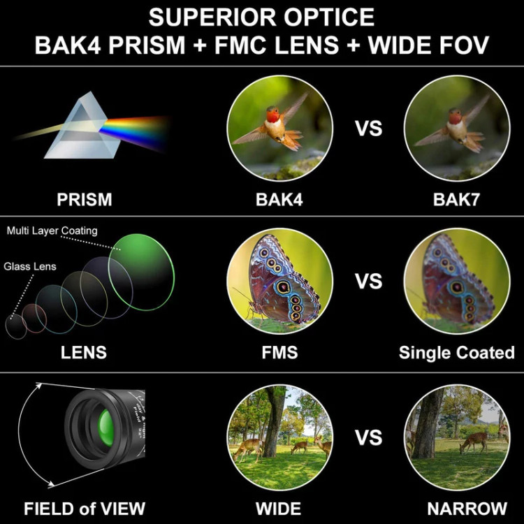 1. انتقال نور 99.5٪: تصاویر با کنتراست و وضوح بالا، آخرین فناوری نوری، مجهز به منشور BAK-7 و لنز پوششی کاملاً چند لایه، می تواند انتقال نور و روشنایی عالی، انتقال نور تا 99.5٪ را تضمین کند. 2. این تلسکوپ میدان دید وسیعی دارد و در هنگام ماجراجویی در فضای باز از بهترین دید برخوردار است