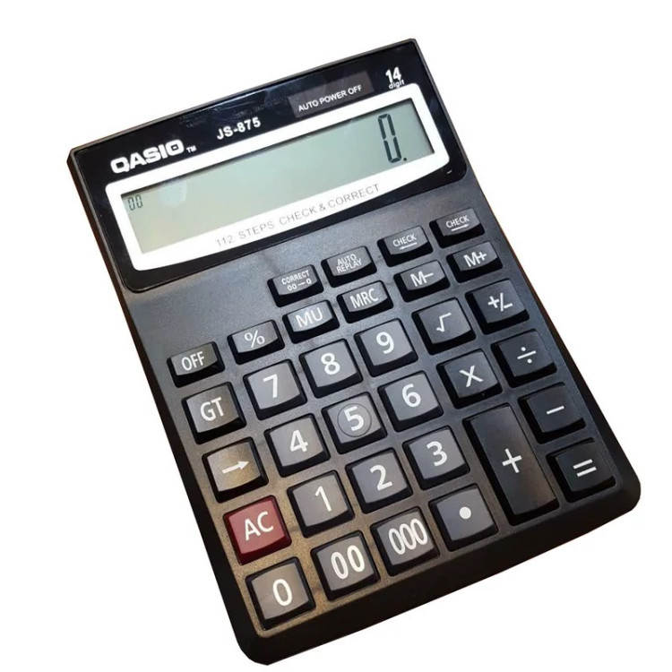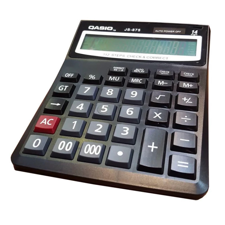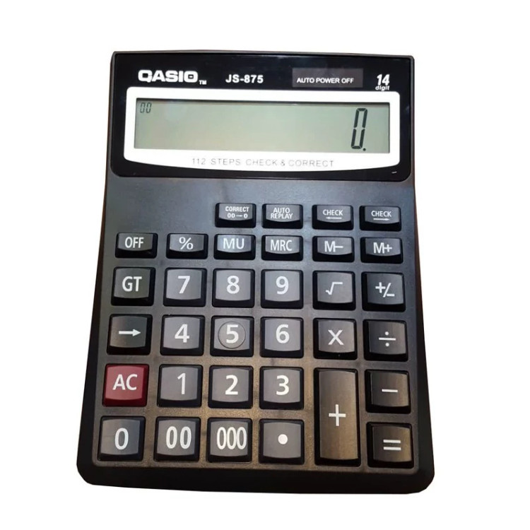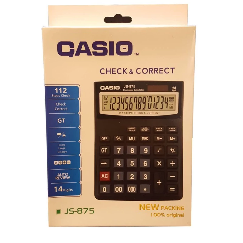 ماشین حساب مدل JS-875 از جمله ماشین حساب های خوشدست، با طراحی زیبا و کم حجم می باشد.ین ماشین حساب دارای ویژگی هایی چون کلیدهای حافظه M+ ،M- ،MRC،کلید های دو صفر و سه صفر،کلید جمع کل (GT) ،کلید Auto Replay ،قابلیت بررسی ورودی ها تا 112 مرحله ، کلید correct جهت تصحیح اشتباه،کلید برای به دست آوردن مقدار رادیکال و... می باشد