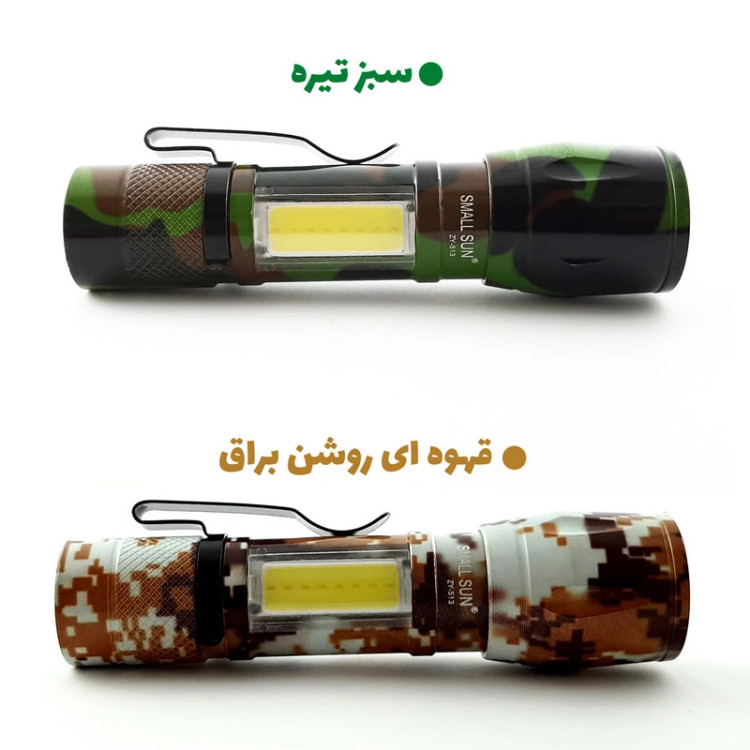 امروزه چراغ قوه به یک وسیله لازم و کاربردی تبدیل شده است، بخصوص برای افرادی که اهل طبیعتگردی و کوهنوردی هستند داشتن چنین وسیله ایی بسیار کارآمد بوده است. یکی ازین چراغ قوه ها، چراغ قوه طرح نظامی اسمال سان مدل ZY-513 می باشد که از لحاظ کیفیت و روشنایی و برد نور در رده ی بالایی قرار دارد، و می تواند بهترین وسیله برای کوهنوردی، کمپینگ و .. باشد و از آن نهایت لذت را تجربه خواهید کرد.جنس بدنه چراغ قوه طرح نظامی اسمال سان مدل ZY-513 از آلیاژ آلومینیوم محکم است و بسیار مقاوم در برابر ضربه می باشد. این چراغ قوه از دو لامپ بسیار قوی و شفاف از نوع COB+XPE تشکیل شده است که با جرات می توان گفت که طول عمر این لامپ ها بیش از 100 هزار ساعت می باشد، یک لامپ در جلوی چراغ قوه به عنوان لامپ اصلی و دارای دو حالت نوردهی مستمر و تناوبی و یک لامپ در کنار بدنه چراغ قوه با یک حالت نوردهی قوی می باشد. چراغ قوه نظامی اسمال سان مدل ZY-513 از لحاظ برد نور و میزان روشنایی نیز در رده بالایی قرارر دارد به طوریکه برد نور آن 100 متر و میزان روشنایی آن بین 200 لومن می باشد. قابلیلت زوم کردن چراغ قوه قوی اسمال سان، این امکان را به شما می دهد تا با دید گسترده تر محیط اطرافتان را مشاهده کنید، از مزیت های دیگر چراغ قوه پرنور اسمال سان، مقاومت آن در برابر آب است و شما می توانید با خیال راحت در مواقع بارانی و یا حتی محیط مرطوب نیز از آن استفاده کافی را ببرید، همچنین دارای یک گیره نگهدارنده برای استفاده آسانتر و جلوگیری از آسیب به آن است که حالت خودکاری زیبایی هم به چراغ قوه داده است.نحوه شارژ چراغ قوه نظامی اسمال سان مدل ZY-513 توسط کابل یو اس بی می باشد.