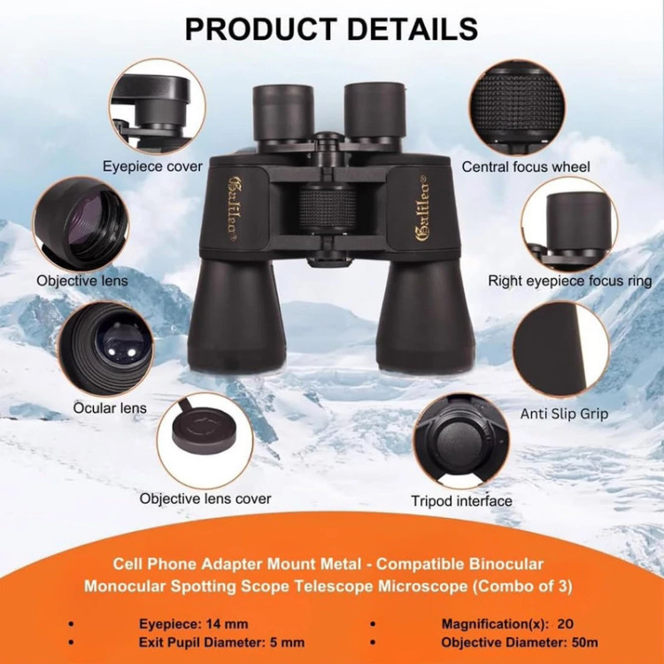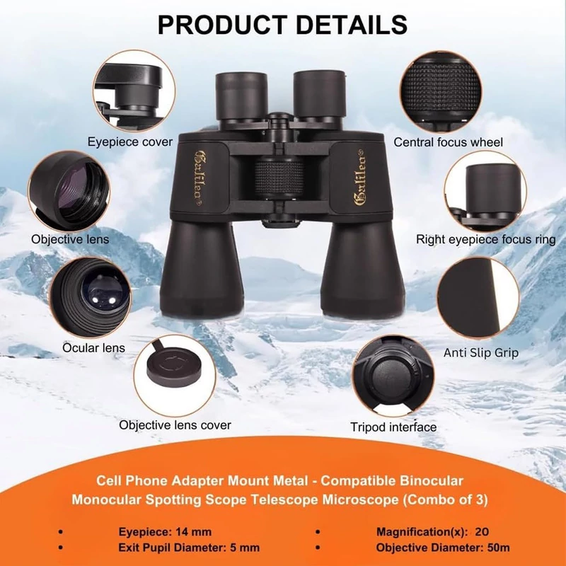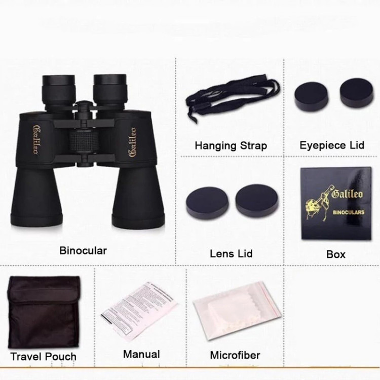 دوربین دوچشمی مدل 100X50 به اندازه کافی جمع و جور و سبک است که بتوانید آن را در کیف یا کوله پشتی خود حمل کنید. برای پایداری بهتر، آن را با دو دست نگه دارید. این دوربین دوچشمی از پلاستیک ABS ساخته شده است و زره لاستیکی ضد لغزش برای گرفتن ایمن، ضد آب و ضد آب ساخته شده است. دوربین دوچشمی حرفهای با یک کیف حمل، درپوشهای لنز ایمن، پارچه نخی، بند گردنی و یک دفترچه راهنما ارائه میشود.