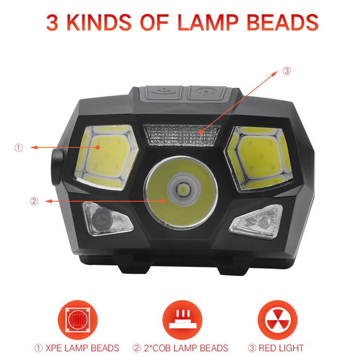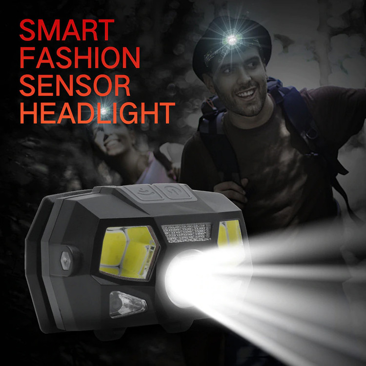 چراغ سنسوردار مدل Sensor Head Light 101 دارای روشنایی بالا و 5 حالت روشنایی - دارای چراغ جلو ارتقا یافته با 3 منبع نور، LED و 2 چراغ COB، و همچنین دارای دو سوئیچ کنترل نور و کنترل سنسور می باشد، 5 حالت روشنایی: نور زیاد، نور کم، چراغ های COB روشن، چراغ های LED+COB روشن و چراغ SOS قرمز.